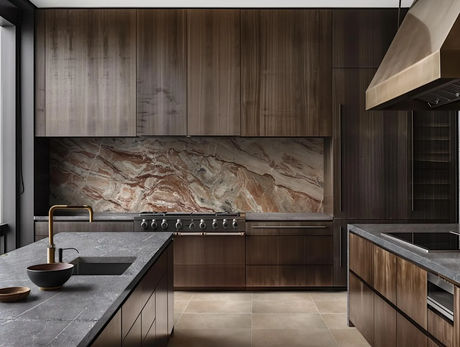Rich wood cabinetry and dramatic stone backsplash blend to create a sophisticated kitchen. Explore these materials to elevate your space with natural elegance and contemporary flair.